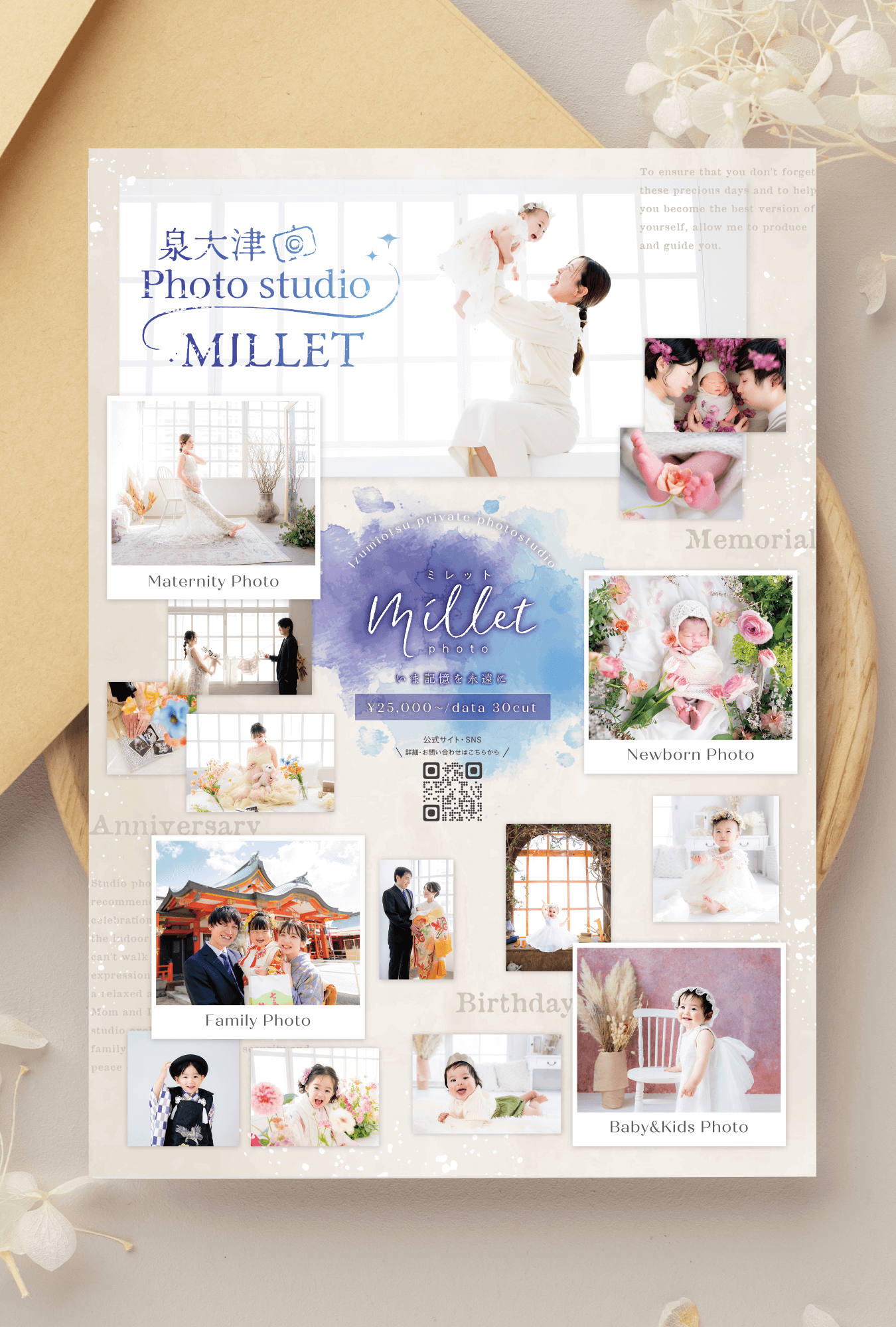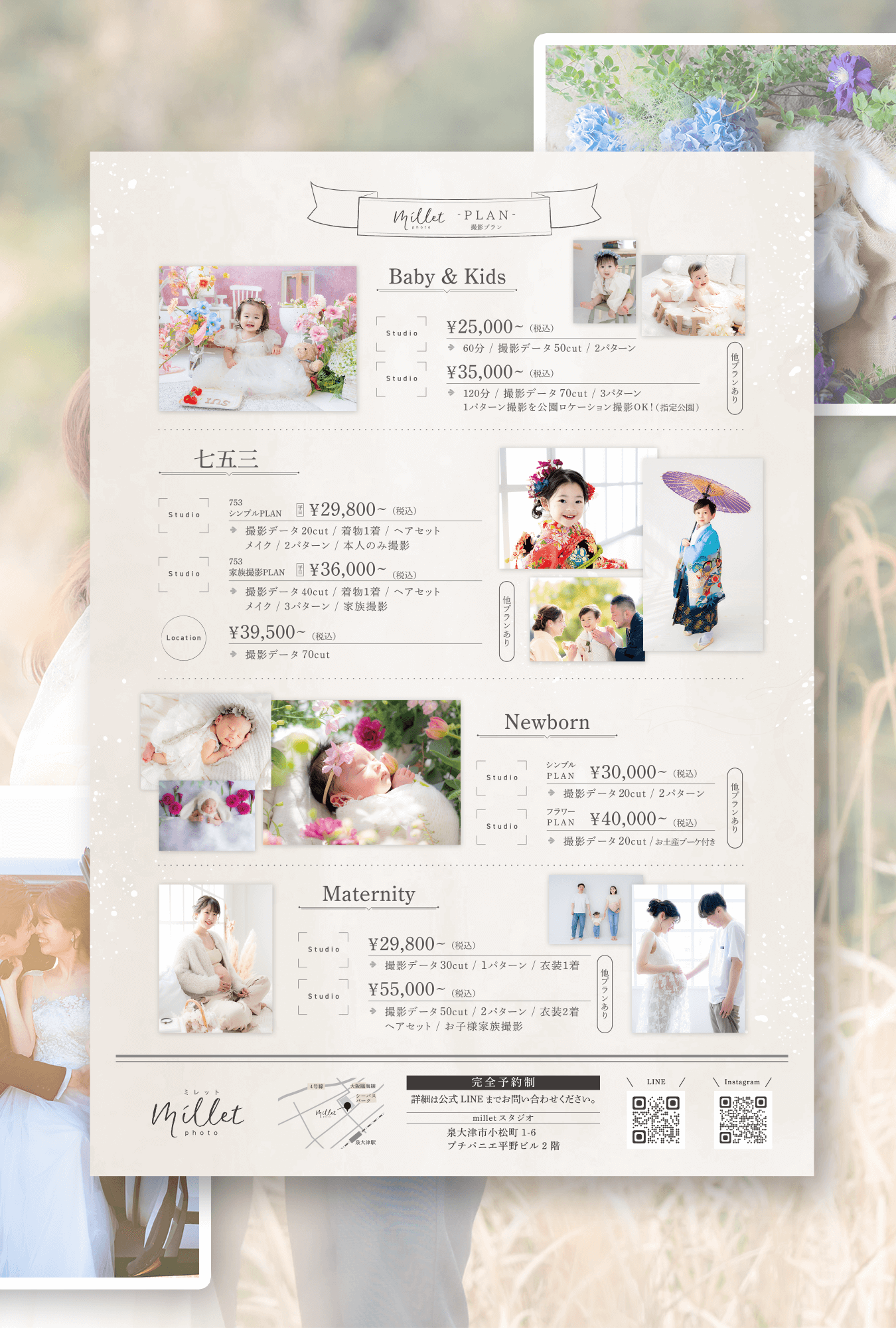 マタニティ、ニューボーン、ブライダル、キッズと、多彩な撮影ジャンルを扱うスタジオの魅力を、ビジュアル中心で表現しています。